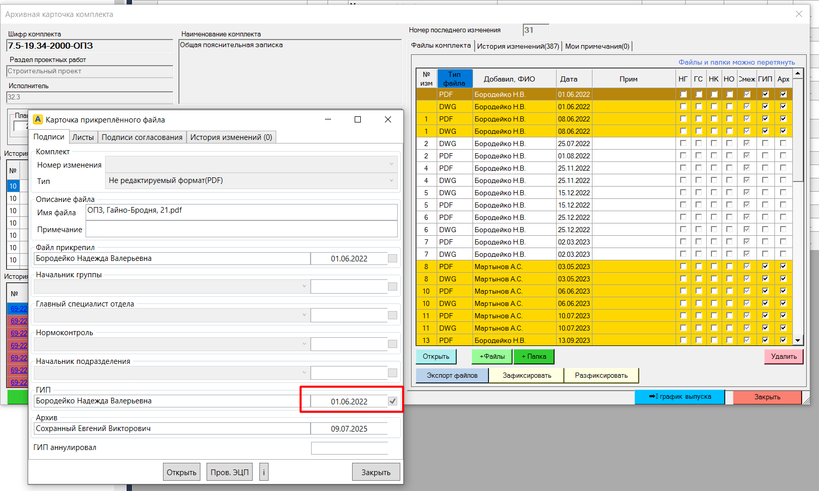 В архиве в карточке отображается подпись помощника ГИПа вместо основного подписанта.