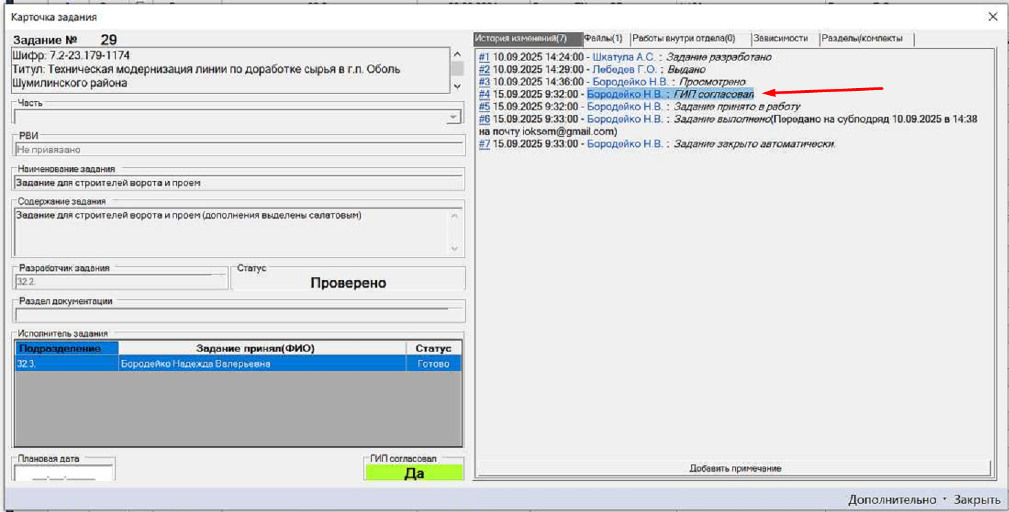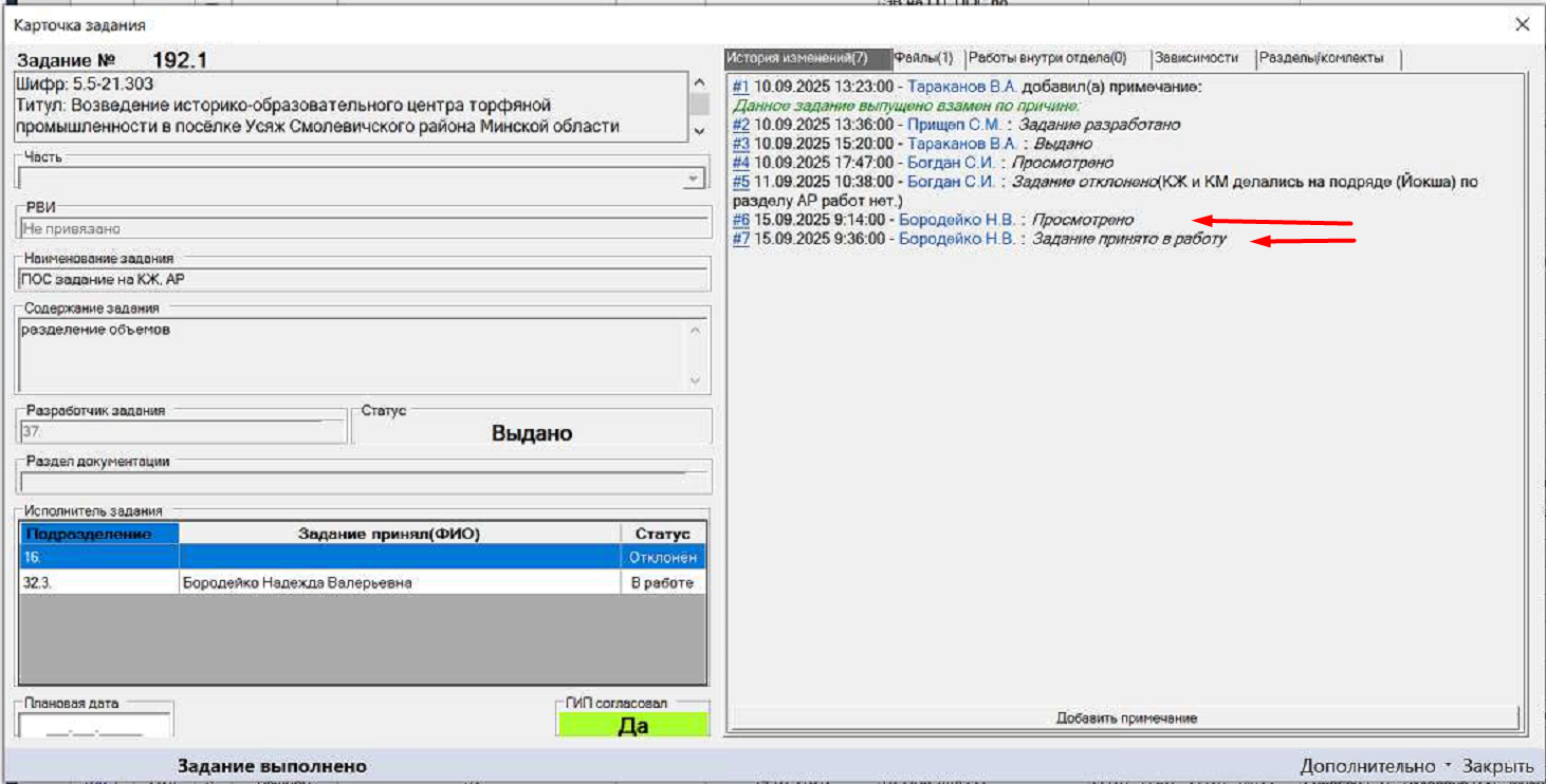 Бородейко (роль ГИП, отдел 32.3) хочет только принять взаимное задание, но при этом срабатывает, что она согласует задание. Это видно по истории, что сперва согласовала, а потом приняла в работу (скрин 3).