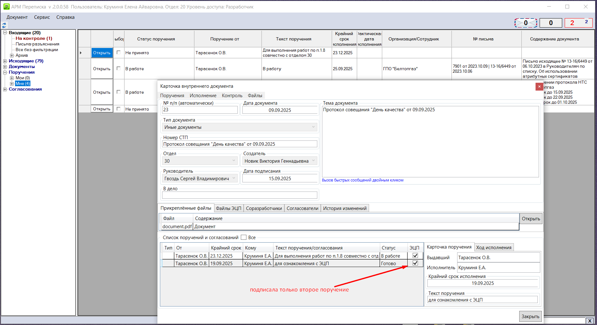 После того, когда закрыла второе поручение (ознакомление с ЭЦП), в карточке появились две галочки, что оба поручения подписаны ЭЦП, но первое поручение в статусе "В работе".