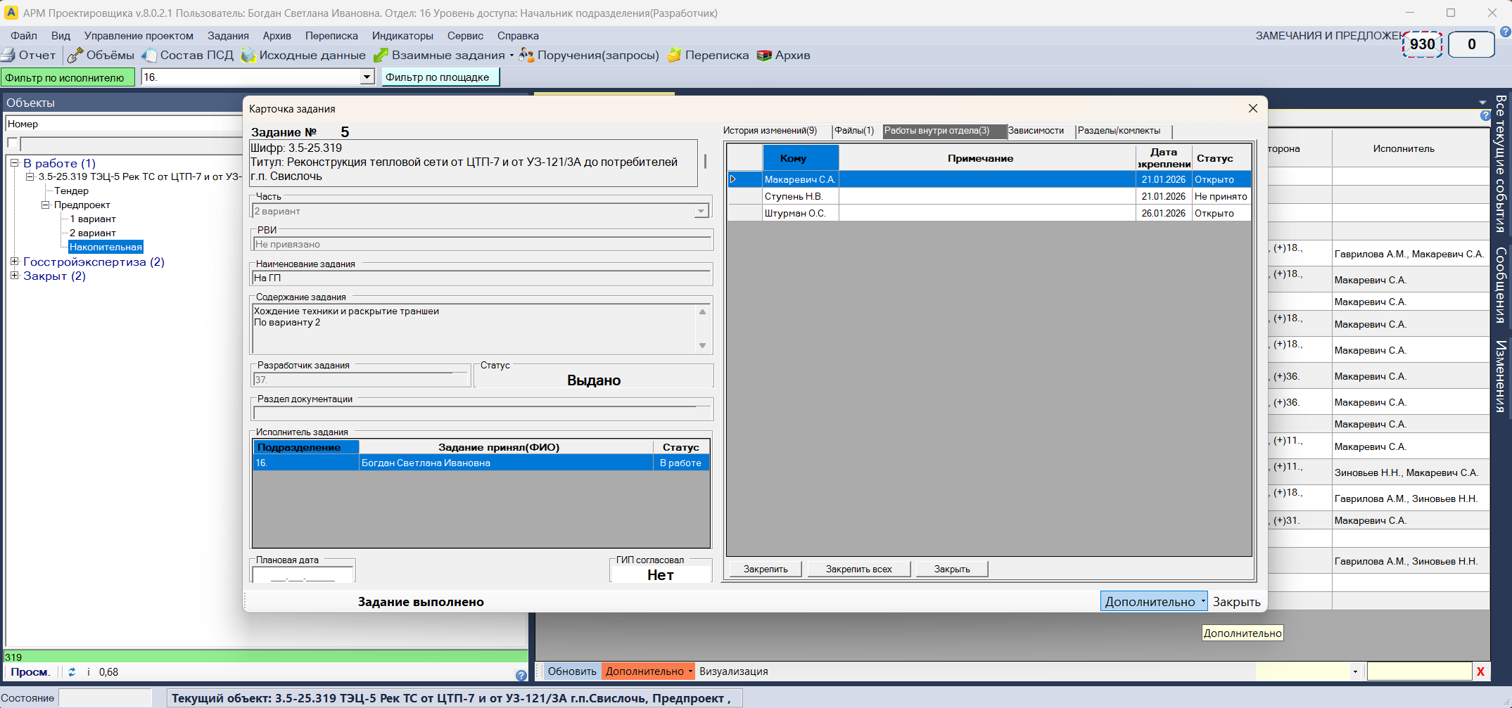 Во взаимных заданиях начальник выдает "Работы внутри отдела".